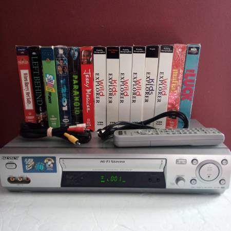 Hi I have a good working Sony 19 Micron Head HI-FI Stereo VCR for sale. It has both front and rear jacks for easy hookups. Flash Rewind/ Instant Replay/ Commercial Skip. Heads and rollers have been cleaned. From a smoke free home. Comes with Remote, batteries, cables and 14 VHS tapes. Tapes have been played or tested and seem to play very good. VCR picture and sound is very good. Works like a new VCR. Very clean. Plays, fast forwards. rewinds, slow motion and ejects tapes all good. Arrangements can be made if you want to test it. Not interested in separating this package $55 for it all.