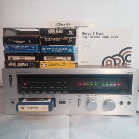 Hi I have a JCPenny 8 Track Player with 10 tapes and instruction manual. for sale. Player works but being sold as is sometime some tapes don't want to automatically switch tracks. Or a few times it seemed to play entire tape in 1 track. Has great sound and tapes had new foam put in years ago. I think it's the black plastic piece to the left of the head. My guess I'm not a expert on 8 track players. If interested or have questions or want to check it out give me a call Chad 1(606)521-405five. Thanks asking $55 for this package. Woodgrain in good condition. Cash only I do not ship.