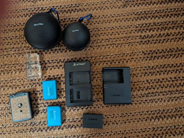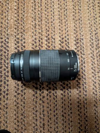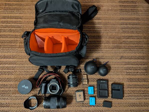 Canon Rebel EOS SL2 camera with several accessories: standard lens, 75-300mm lens, telephoto lens, 3 batteries, Amazon Camera Bag, Glass Ball with 2 sizes for interesting photos, and telephoto...