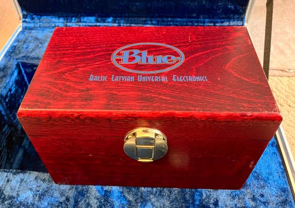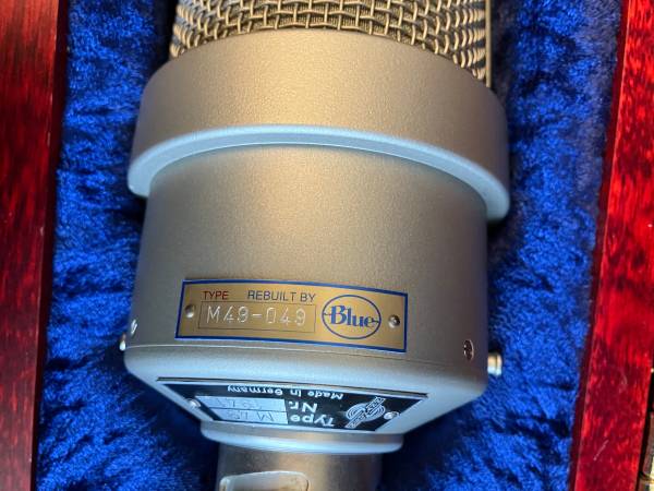 Blue (Baltic Latvian Universal Electronics) Type M49 in case with power supply and cords. (M49 manufactured Berlin 1960 and uses a Telefunken AC701.) This is a Blue-modified Neumann M49 manufactured late 2002. It appears to have the Neumann PE/Gold-plated diaphragm-type capsule introduced in 1960. From an estate sale. Looks hardly used. Almost not even a scratch on any of it. Even the case shows minimal wear. Wooden box has a few scuffs on sides.