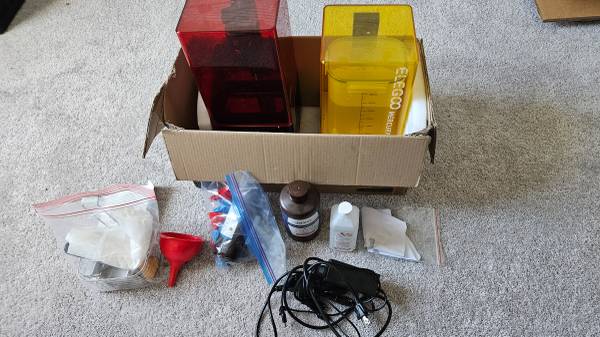 Good condition Elegoo Mars and wash station. Comes with funnels, extra resin, isopropyl alcohol, and power adapters.