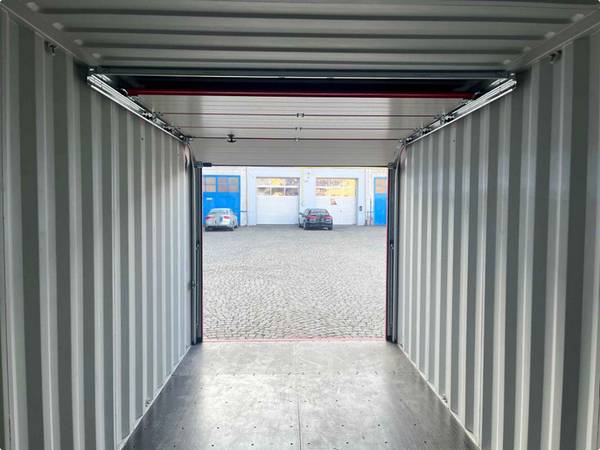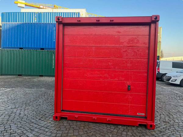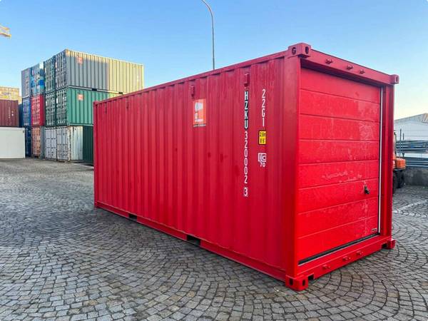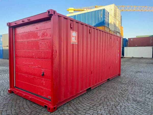 6-meter (20-foot) shipping container in red, fitted with sectional garage doors for convenient access. Strong and secure, ideal for workshops, storage, or custom use.