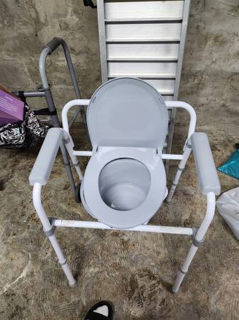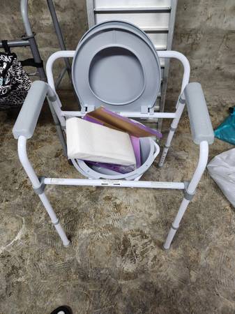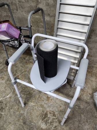 for sale is a 7ft portable wheelchair ramp, used. Added anti slip tread. Holds up to 600 lbs. Is NOT lightweight. I am a 47 year old female weakling, but was able to carry and move this when needed by my mother. Will include the leftover tread if want to retread. Also have a bedside commode my mother refused to use. Will include the absorbent pads and lavender scented bags that remain. Not unopened, my mother used a few of the bags and pads for her diaper disposal. Used walker with accessory bag. Secured with the velcro attached to bag, easily removable. Walker has the ski type footies after wearing out several tennis balls. Items have been in storage for 6 months. 250 for ramp alone, 25 for commode, 15.00 for walker. Or 250 for all 3 items. Will meet in public common area for safety reasons. Please text if interested, and do not ask if I will give for free, Still paying medical fees and need the funds to help.