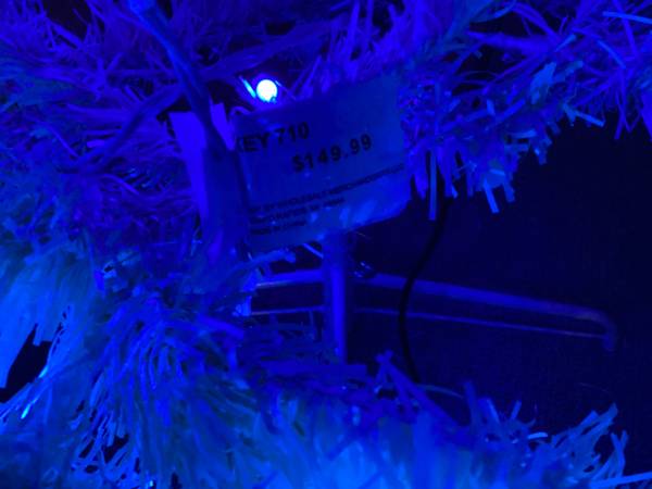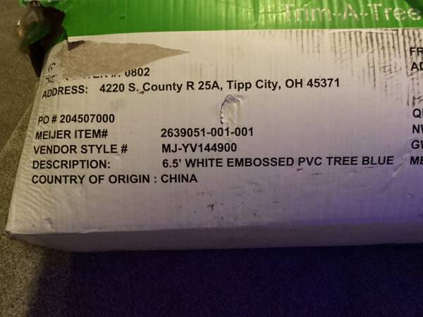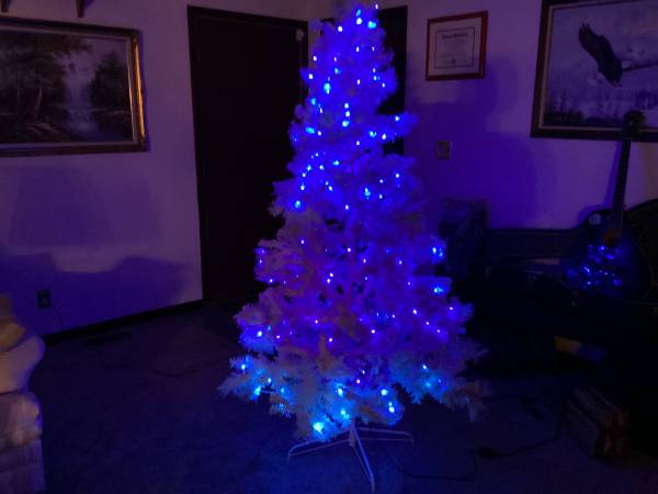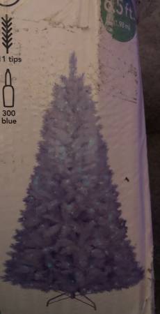 For Sale: Preowned in Good Condition $35.00. White Embossed Arctic Pine Christmas Tree. Pre-lit LED Blue. Height: 6.5’. Weight: 21 lbs Measures: 44X10X12.5 Inch With Original Box