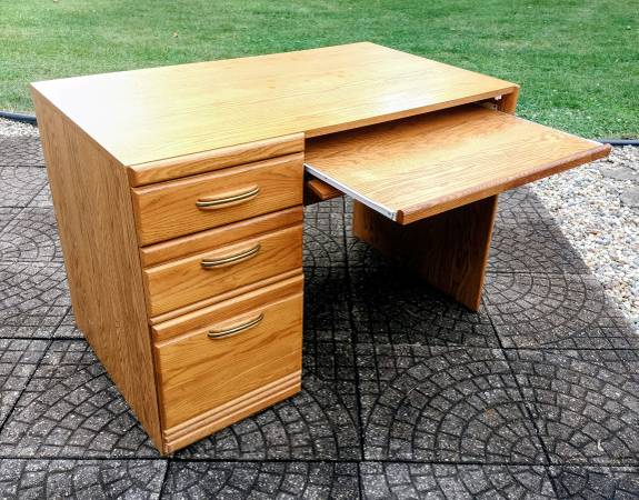 Oak Desk Solid oak drawer fronts Desk is laminate Pull out shelf for keyboard 45 x 27 x 30 High Smoke pet free Pick up north side of brownsburg Cash Fcfs