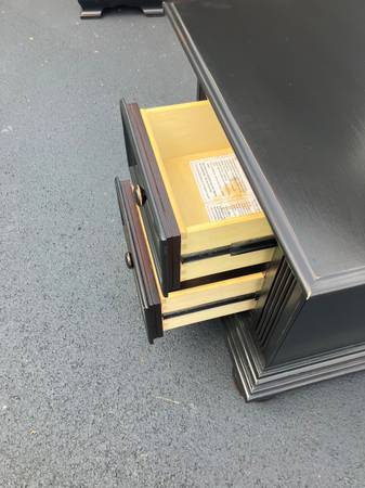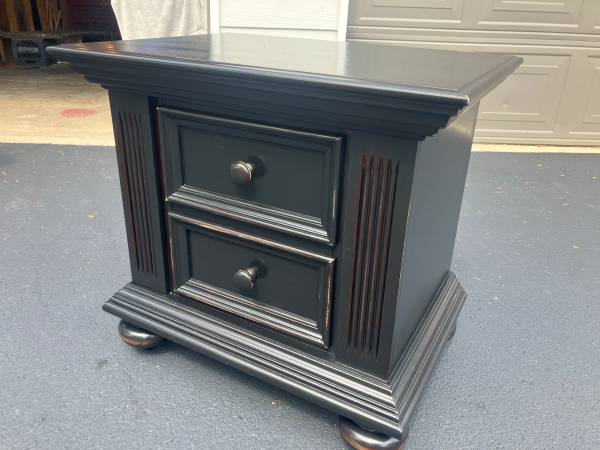 Sturdy multifunctional nightstand. Just finished by Kirt in distressed black with hand brushed top coats of satin lacquer. 25” wide x 18” deep and 24” tall.