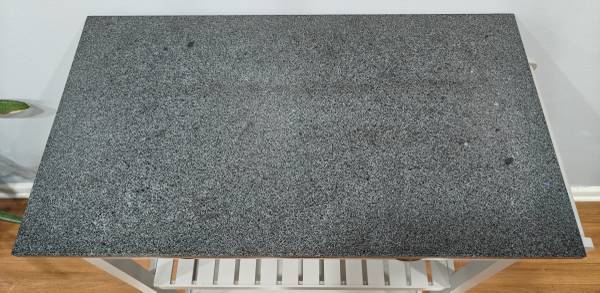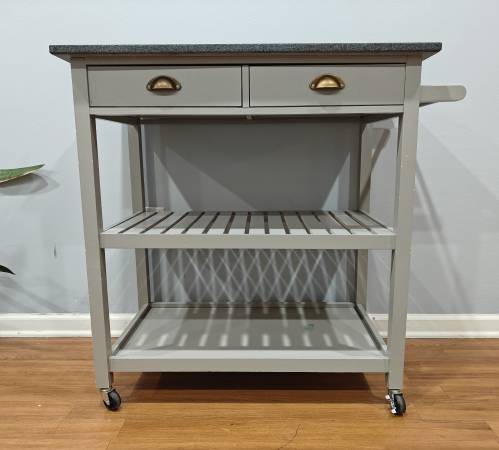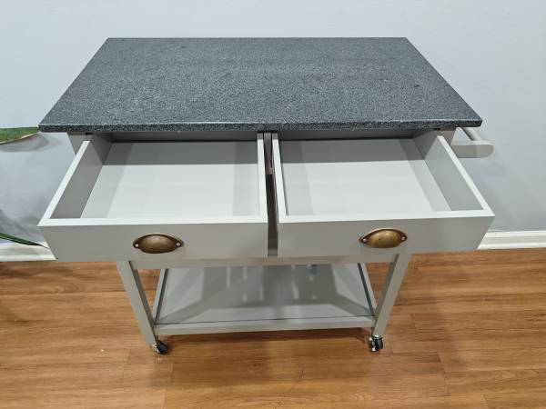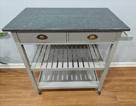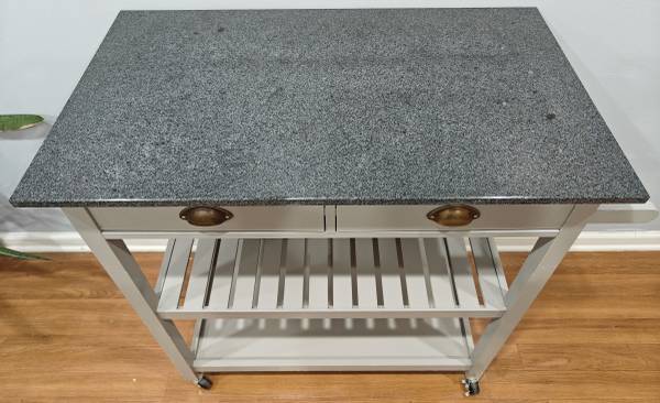 Functional and stylish kitchen cart with a real granite top surface and light gray wooden frame. The countertop features a dark speckled granite pattern—durable, stain-resistant, and easy to clean. Includes two drawers with brass cup handles, a slatted middle shelf, and a solid bottom shelf for storage. Mounted on caster wheels for easy mobility, with a side handle for pushing or hanging towels. Excellent condition and ready for use in kitchens, workspaces, or utility areas. Heavy — requires two people to move safely.