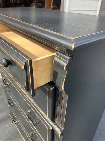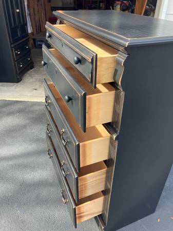 Beautiful like new oak multifunctional dresser . Just finished by Kirt in distressed black with polyurethane topcoats. 36” wide x 18” deep and 50”tall.