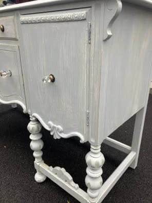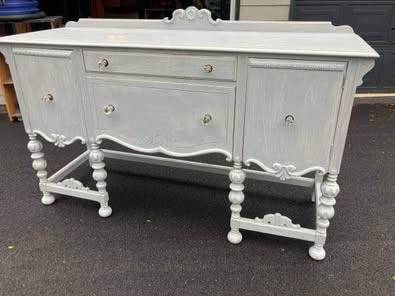 Beautiful sturdy antique buffet. Just finished by Kirt in a distressed gray enamel with hand brushed polyurethane topcoats. 66” wide 21” deep and 39” tall.