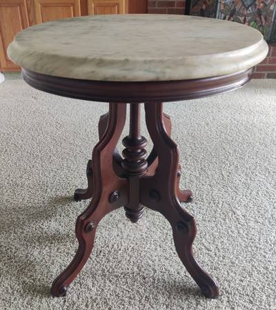 The marble surface shows gentle wear consistent with age, adding to its authenticity. The woodwork remains in excellent condition with no visible flaws or blemishes.
