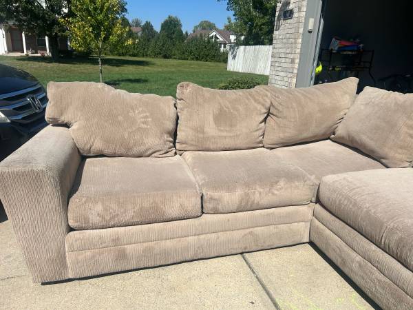 Comfy sectional (3 piece), great condition. Freshly cleaned - no smoking or pets Dimensions are 132 in (right side) x 114 in (left side) x 30 in deep x 31 in high