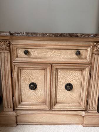 Add timeless elegance to your bedroom with this beautiful vintage solid wood bedroom set. Includes a sturdy bed frame, two matching nightstands with stunning marble tops, and a spacious dresser—perfect for a classic or shabby-chic decor. The set features a charming distressed finish with intricate carvings and antique-style hardware. The bed supports a king mattress size.