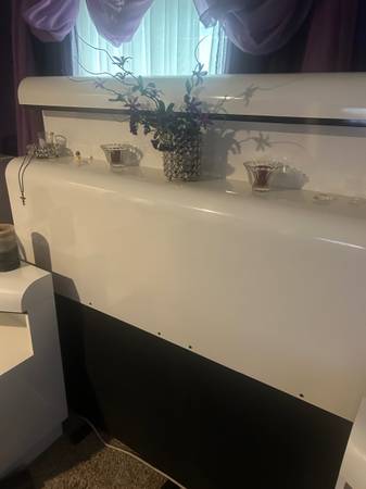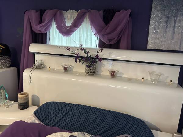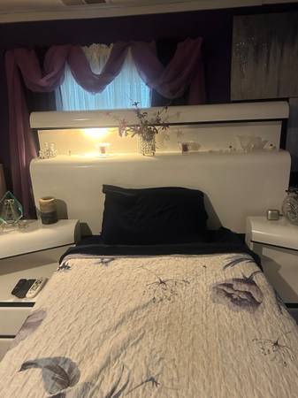 White lacquer queen size head board with 2 lights. 2 matching end tables.