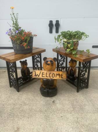 Oakleaf wrought iron, powder coated black, with old barn wood tops (sealed with Total Boat Spar Varnish) $250 - Round top D-22" x H-22 1/2" $275 - Rectangle top D-12 1/2" x L-29" H- x 23" $300 -...