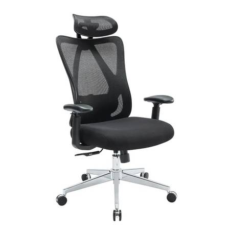 This ergonomic office chair features an adjustable high back, reversible headrest, and lumbar support for all-day comfort. The breathable mesh back and thickly padded seat enhance airflow and relaxation. Built with a durable, BIFMA-certified gas lift and a sturdy aluminum base, it supports up to 330 lbs. The chair is easy to assemble and comes in Black or Grey.