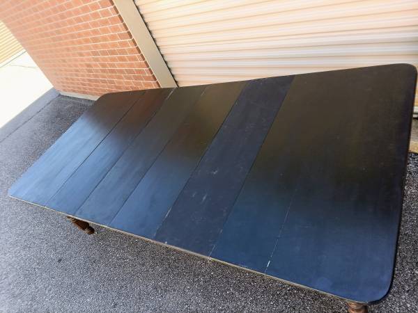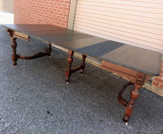Circa 1800s or early 1900s. Really cool table, look at the elaborate woodwork around the legs and frame. Working porcelain casters. Sturdy and fully functional. 45 x 45.5 inch top without the leaves, extends to 93 inches with all four leaves in place. Leaves are 12 inches apiece, so table can be set to various lengths. Top and leaves were painted black at some point, but they could probably be refinished back to original woodgrain.
