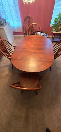 Keller brand lighted hutch, 84 x 60 x 19, very good condition. Keller brand dining room set, 60 x 42 plus 2 - 18 inch leaves. Comes with 6 chairs and table pads. 1 chair has some chew marks at the bottom from a puppy (shown in photo). Must pick up, FCFS, Xposted. PM with any questions