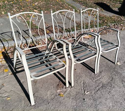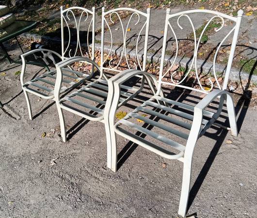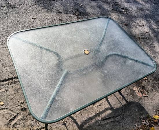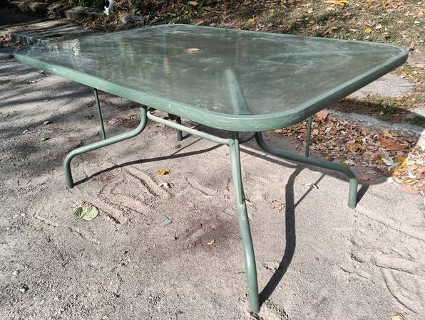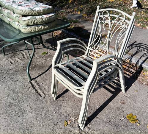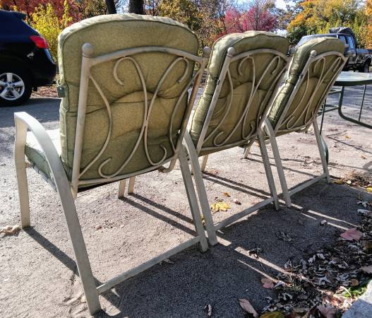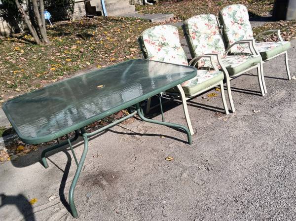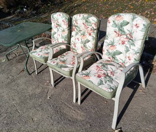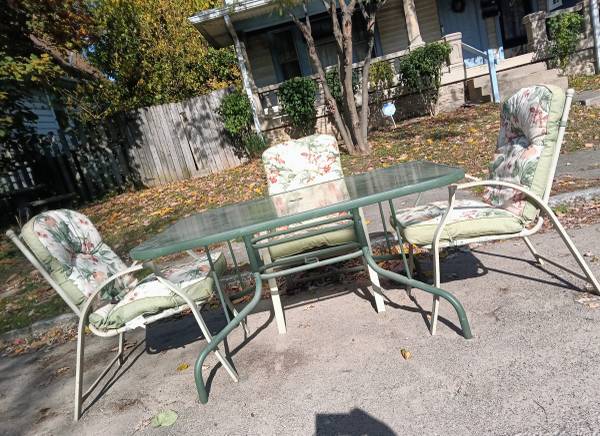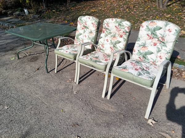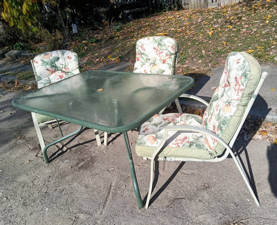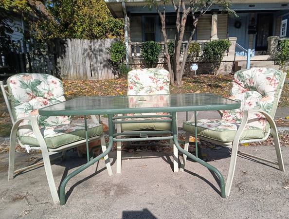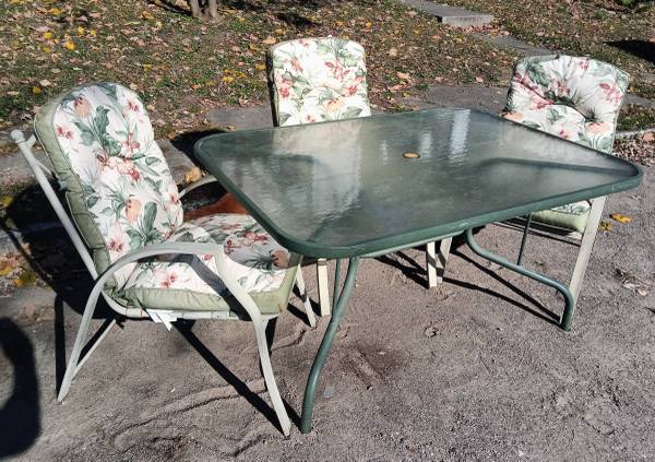 List price includes table, 3 chairs, and cushions. Glass top table is sturdy and has hole for umbrella. Stackable chairs are sturdy and work with or without cushions. Cushions are clean. Nice functional patio set and looks good.