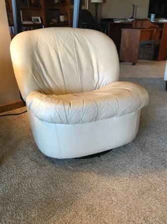 For sale - white leather swivel chair. Original owner, very good condition, 360 swivel, rocks back and forth. Dimensions as shown.