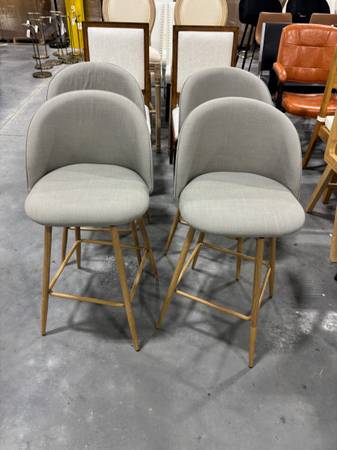 Brand New Haseeb 26" Modern Swivel Upholstered Counter Height Bar Stool with Curved Back Pebble Grey Fabric/Oak Legs (Set of 4) Dimensions H 36" W 18" D 19" Located in Noblesville Just north of...