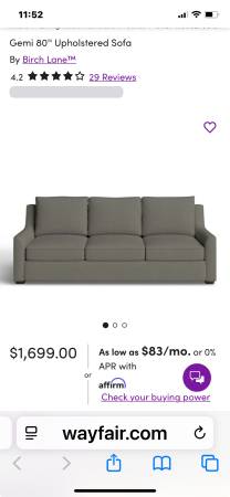 Brand New Birch Lane Gemi 80'' Upholstered Sofa Couch Bayou Gray Dimensions 39'' H X 80'' W X 37'' D Located in Noblesville Just north of Costco next to Indy Premier Soccer Retails For $1,700 Come...