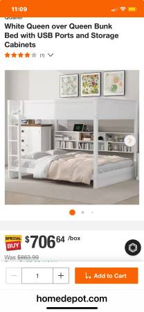Brand New White Queen over Queen Bunk Bed with USB Ports and Storage Cabinets