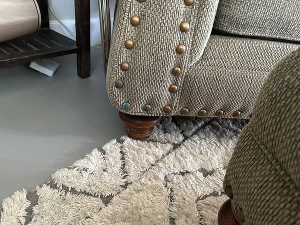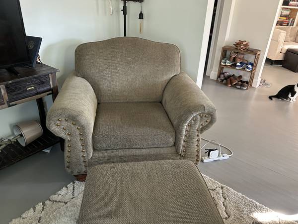 This chair has been in storage for most of its life. We only recently put it in the house about 6 weeks ago but it is just too large for our space. It's very comfortable and spacious. It's almost a chair and a half and can accommodate a pretty large person. It also has a large matching ottoman. It looks gray in the pictures but it's more of a sage green. A couple of the rivets are discolored (picture included, could probably be fixed with some sort of vinegar solution?) but otherwise it's in great shape. I'll also give it a good clean with my Bissell Green Machine before pickup. The feet screw on and off (we had to take them off to fit it through our front door). We cannot deliver, you must pickup but I can help load into your vehicle if need be. $50 OBO cash or Zelle only.
