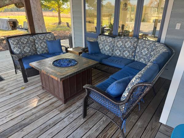 Radius couch seats five, loveseat, seats two, fire pit, always kept under rough and protected. 2 years old. Very good condition.