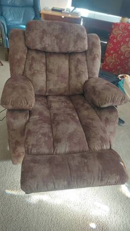 Chocolate brown velvety recliner with heat and massage controls! Reclines by lever on the side. Massage controller fits neatly in side pocket. Swivels 160 degrees. The chair can also gently rock.