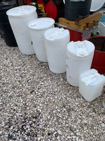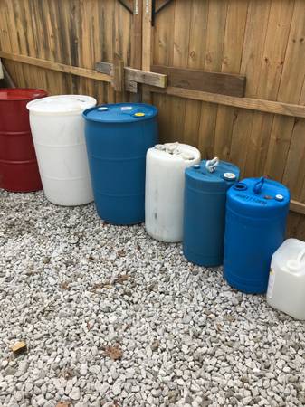 Used plastic poly barrels in 15, 20, 30 and 55 gallon available. Colors in the pictures. They are food grade plastic composition. That does not mean they had food in them. It means the plastic composition is made up so no product leaches into the plastic and they are easily rinsed or cleaned out. They all vary in different previous content. I leave the labels on so you can decide.