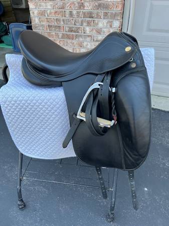Prestige Dressage Saddle 17" wide (34), black, excellent condition. Reflocked every year of use by a certified saddle fitter (wool flocking).