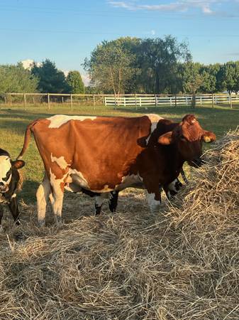 I have two Holstein cows for sale. The black cow had her calf 5/5/25 and the red one had her calf 5/25/25. Both calves have done extremely well and I plan on keeping them. Both came from an Amish dairy. Black cow was born 12/21/22 and Red cow was born 12/22/22. Both are still in milk. Cows have been grass fed since I acquired them in Feb 23 with weekly grain feeds to keep them friendly. Price is $2400 each.