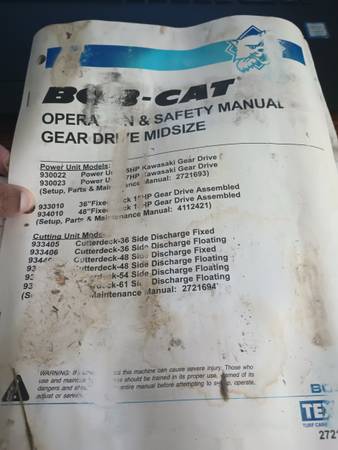 Bobcat lawnmower sturdy but used condition. Operates well and uses unleaded gasoline. Unnecessarily powerful for us to use on a regular basis but will definitely get the job done while it's dragging you behind it. Has original owners manual. Located near community east hospital. Will not give address until buyer is nearby.