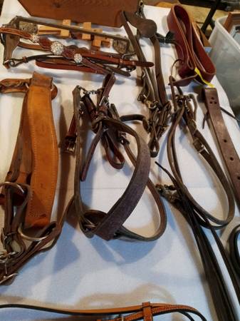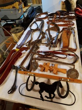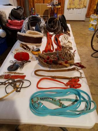 I have a large amount of small tack some new still in bags or tagged and lightly used tack as well. I'm posting only a few pics. The pics don't show the stuff very well but you get the idea. I have western and English pony,miniature horse,draft horse,and horse tack NO SADDLES. there is lots of real fleece sleeves for girths and halters also synthetic halter tubing plain and in color. several halters all name brand and heavy duty nothing i have came cheap its all quality i spared no expense when it came to my horses safety first then comfort and fit. This stuff will last for years if cared for properly. I also have plenty of black rock to care for the leather I have bits for both draft and horse as well as pony i do have a few dwarf horse halters very hard to get.I can go on forever but won't. If you would like to come look and see if there is anything you could use please TEXT ONLY*** show contact info