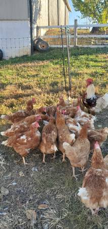 Almost 30 laying hens for sale here on the farm not laying alot right now we're just feeding them our own grains but if fed high protein feed they usually lay well another year. You may have them for $8.50 or 8each if you take 10 or more. If interested please call or text at 7six5 3one8 900seven