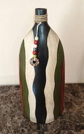 This piece features a bold, sculptural silhouette with a wide base that tapers into a tall, narrow neck. The neck is wrapped in natural twine and adorned with a hanging ornament made of beads in red, white, and black, plus a circular pendant with white markings—adding a handcrafted, tribal-inspired accent. The body showcases vertical wavy striping in earthy tones: matte black, olive green, beige, and reddish-brown. The finish alternates between matte and semi-gloss, giving the surface subtle depth and movement. It’s a visually commanding piece with rustic elegance.