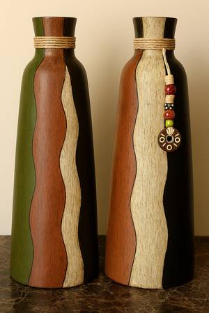 Decoware is known for its handcrafted ceramic pieces that blend earthy palettes, organic forms, and subtle detailing. Often marked as “AAA Imports” from Apopka, Florida, this vintage line includes decorative planters, bowls, vases, and kitchenware. Each item reflects a balance of rustic charm and refined design, appreciated for its nostalgic character and visual warmth. These vases showcase the brand’s signature mix of natural texture and artistic elegance.