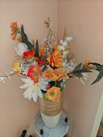 🌸 Arrangement: A lively mix of faux flowers including white lilies, orange poppies, red accents, and soft yellow tones. Full, vibrant, and ready to charm any corner with zero watering required.