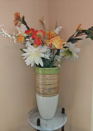 🧱 Vase: Tall ceramic piece with a three-part design: deep green rim, bamboo-style midsection, and smooth off-white base. Solid and substantial—made to stand proudly on the floor, not hide on a shelf.