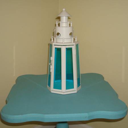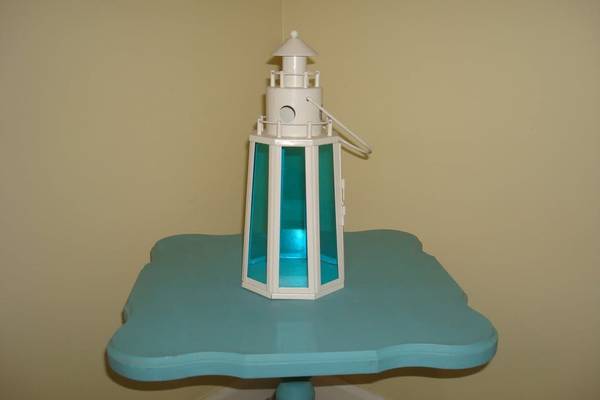 Coastal-style lighthouse lantern with translucent blue panels and a charming white frame. Eye-catching centerpiece with a functional hinged door and hollow interior—perfect for LED candles or ambient lighting. No chips, cracks, or discoloration.