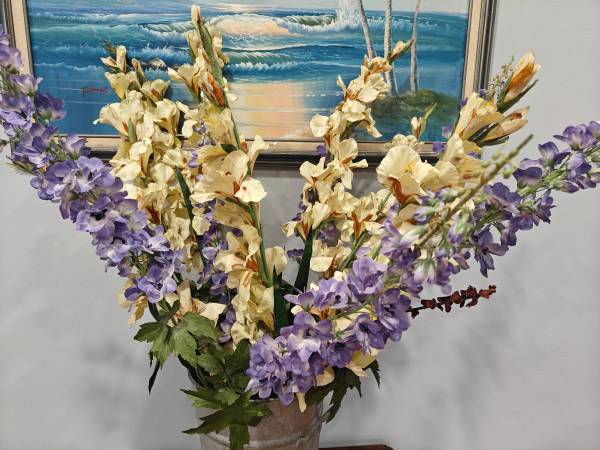 Arrangement: Tall faux gladiolus with maroon accents paired with rich purple delphiniums. Full and dramatic—perfect for adding height and color to any space.