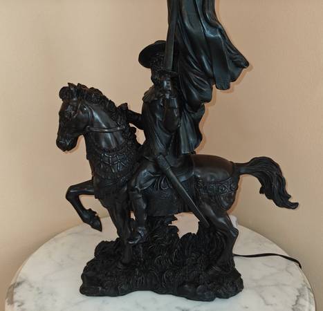 The style blends Romantic-era storytelling with Art Nouveau flair, making it a standout piece for vintage collectors or anyone drawn to historical or equestrian themes. The torch-shaped shade adds a classical touch, reminiscent of old-world heroism and decorative elegance.