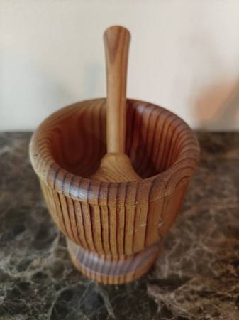 - Pale wood with vertical grain and straight pestle—natural and geometric