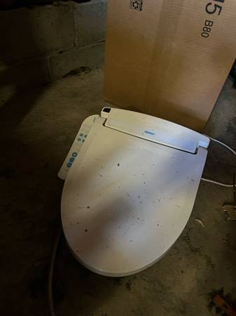 Bidet with heated seat. It was cleaned and just has a bit of dust from the garage on it.