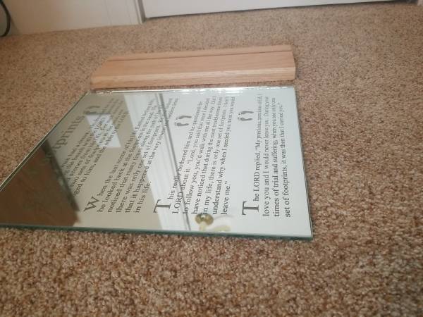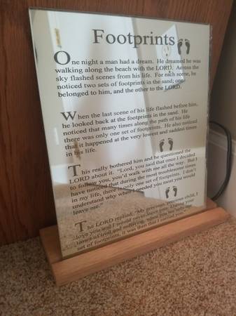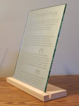 GIFT IDEA!! NEW Footprints in the Sand Christian/Religious 12"x10" Mirrored plaque, oak base. Free standing on oak base. Easy storage when not in use. Great for Gift-Giving!