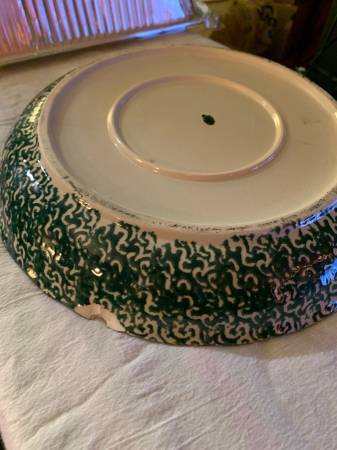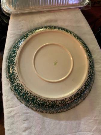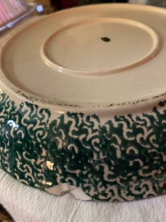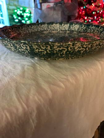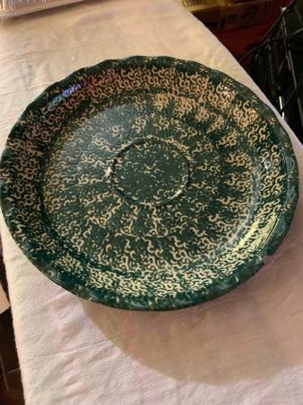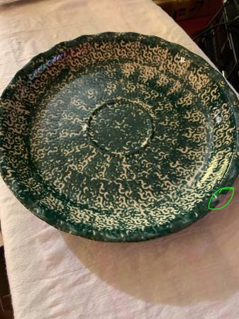 Pie plate ,dish for repurposing Small chip in upper rim Green and cream colored Sturdy! Great for centerpiece project or other displays Approx 10 in. or so Please bring box, bubble wrap etc