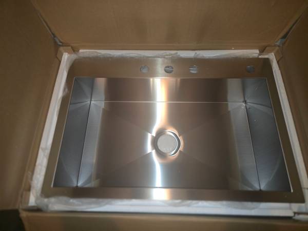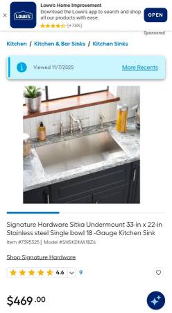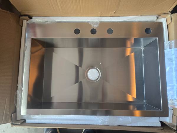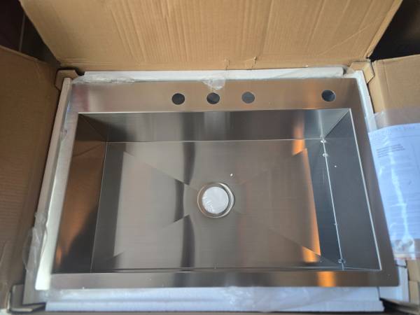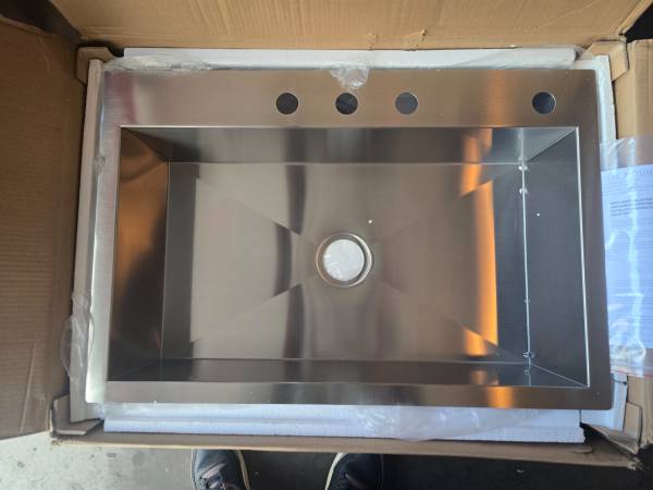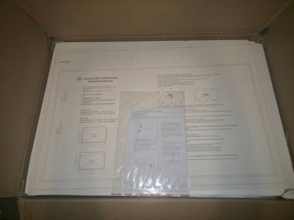 Signature Hardware 33" Sitka Stainless Steel Dual-Mount Kitchen Sink 4-Hole Drop-In or Undermount model# SHSKDMA1BZ4 for sale. Brand new open box flawless condition. Dimensions: 33-in L x 22-in W x 9-in H. 18 gauge thickness. Asking $120. Serious inquiries only please.