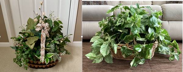 Perfect for staging, fireplace hearth, plant ledge, or brightening a dull corner!! These lovely large faux greenery planters are in excellent condition. The foliage is very thick and lush. The handsome baskets are in neutral tones which will coordinate with any decor. Both are in excellent condition. Always kept in a home with no smoking and no pets.