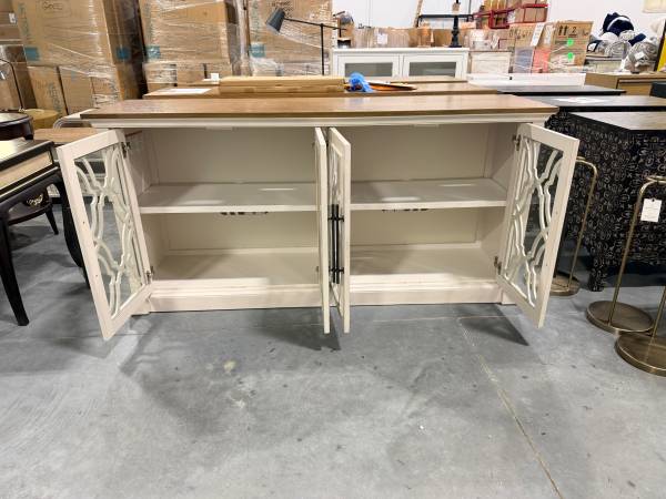 Brand New Huntington 70” Multi-Use Console Cabinet TV Stand White Glass Door Solid Wood Dimensions 19 in. x 70 in. x 33.9 in. Located in Noblesville Just north of Costco next to Indy Premier Soccer...