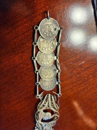 This is a solid, substantial bracelet — not lightweight costume jewelry. The filigree work is detailed and symmetrical, with a distinctive central coin feature. Great for collectors, vintage jewelry lovers, or anyone who appreciates unique statement pieces.